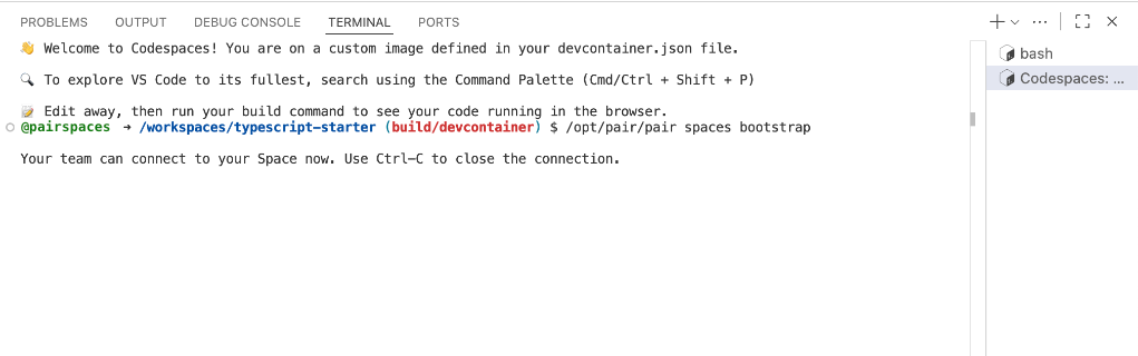 After you create your Codespace, the Dev Container feature will complete in a few seconds in a separate terminal.